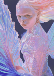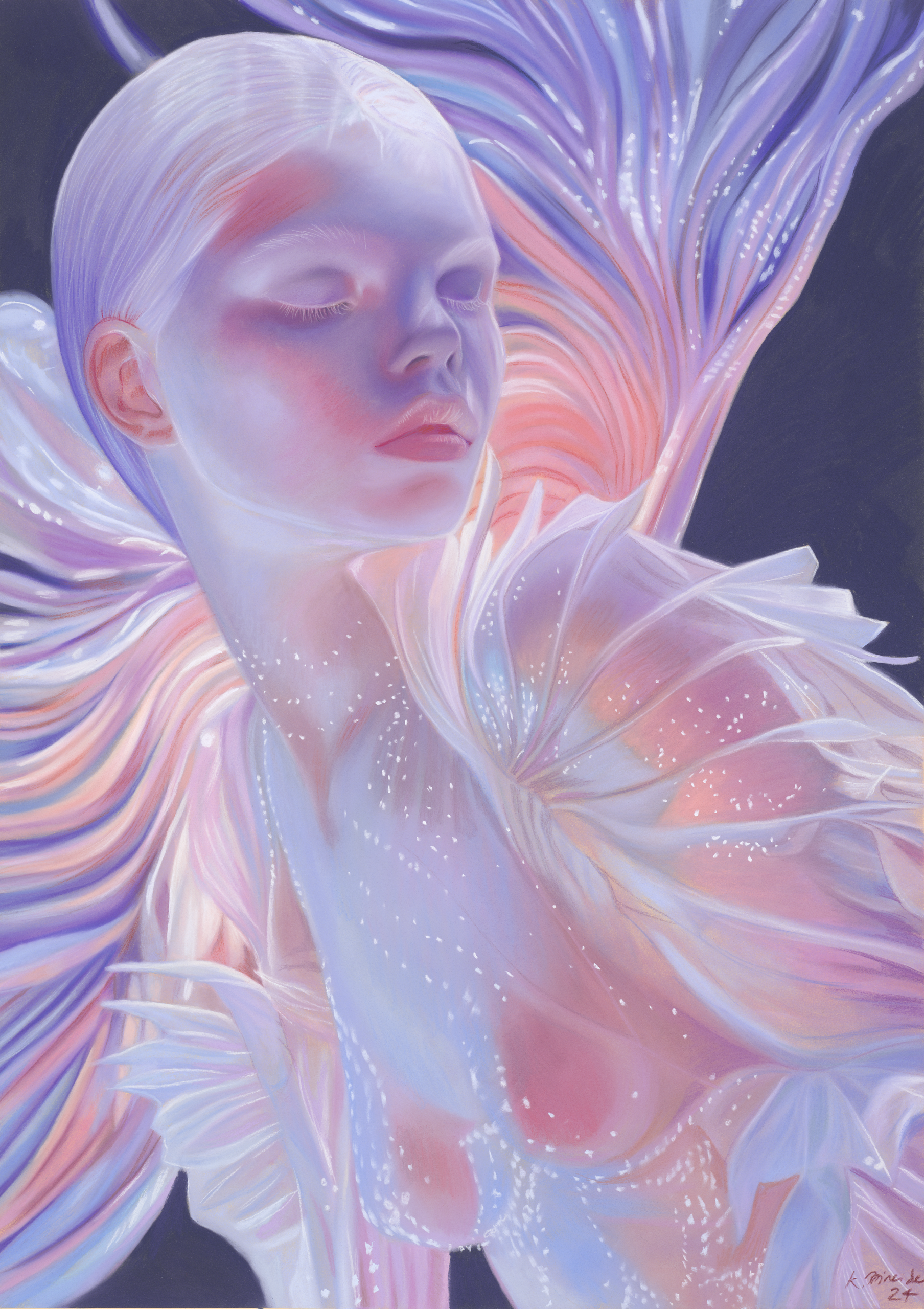 Ergänzt werden die Werke aus Pastell – im Rahmen des synästhetischen Programms der Galerie – mit eigens dafür komponierten Musikstücken, die die Metamorphose von Mensch zu Wasserwesen oder die Welt in der sie Leben, durch Klänge ausdrücken und erfahrbar machen.